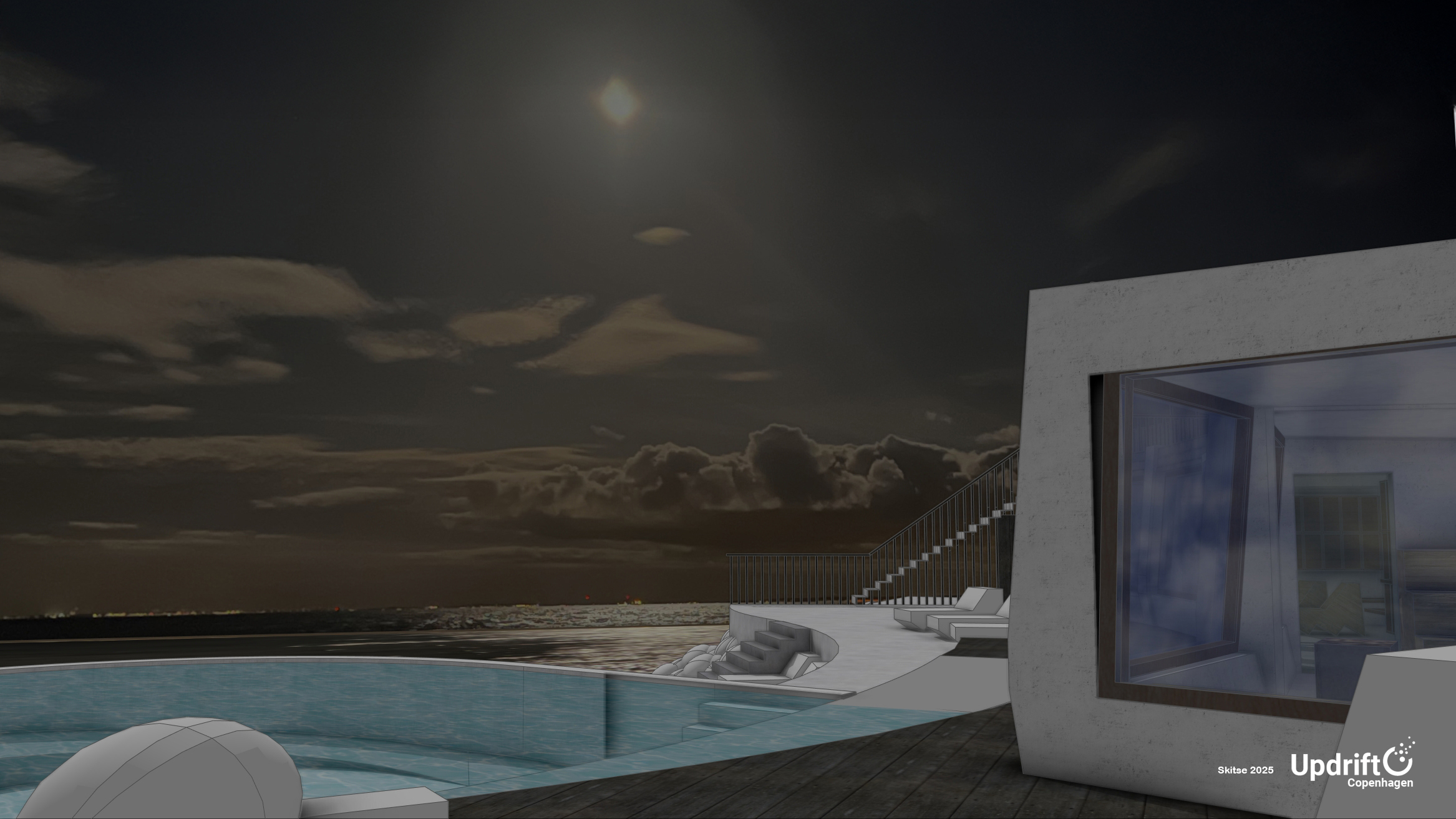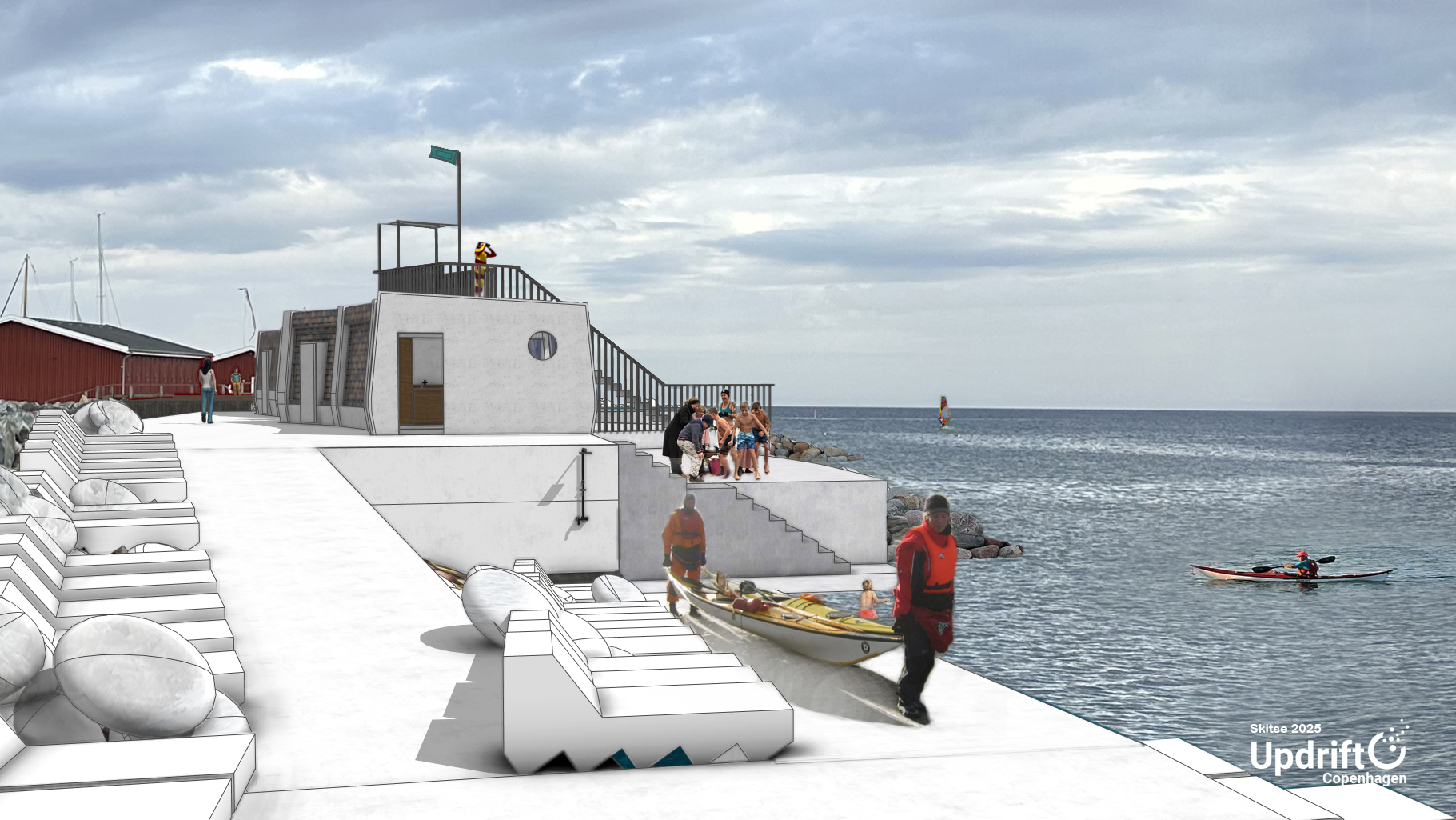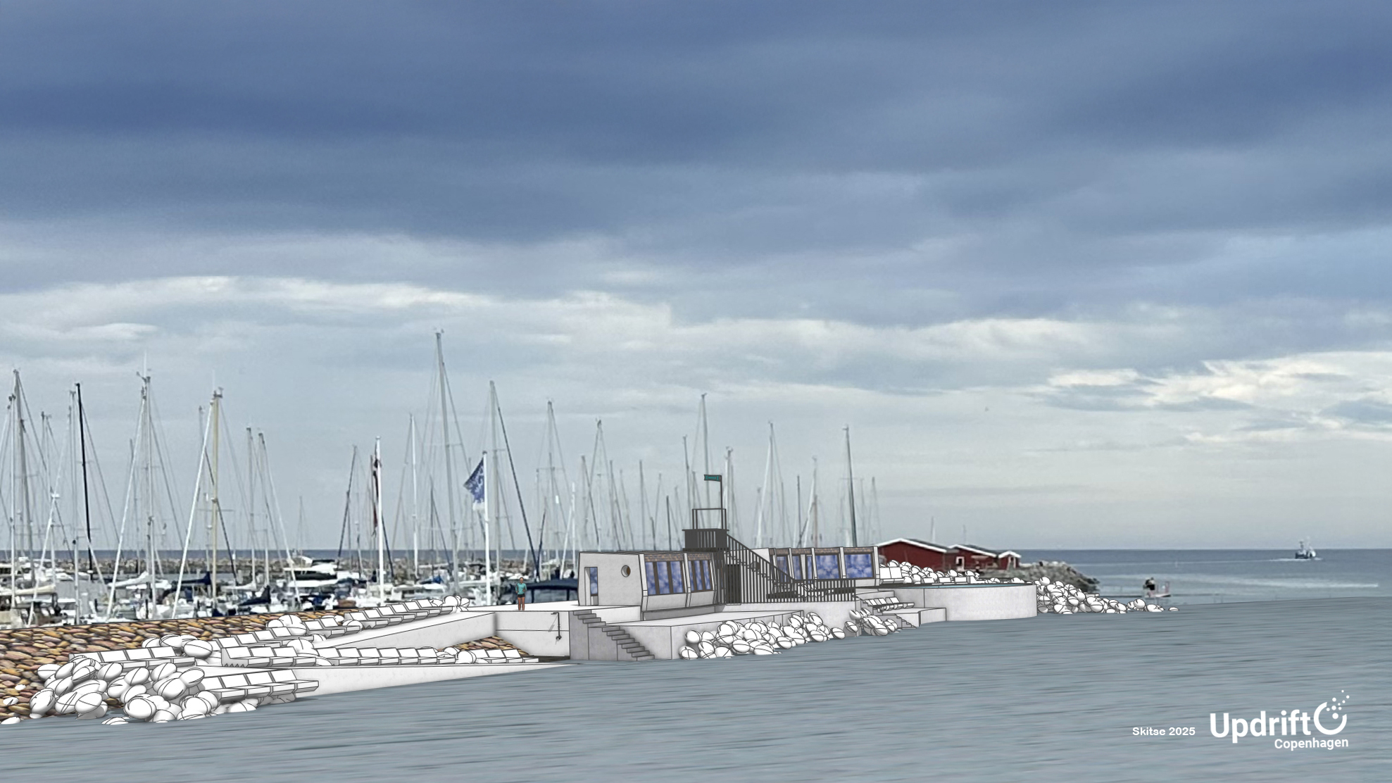 Vi viser her et par skitser, som arkitekt Cathrine Leth har udarbejdet, og vi understreger, at det er foreløbige skitser, som kan ændre sig i projekteringsfasen. Vores plan er at kunne gå i gang med byggeriet i efteråret 2026/2027 og åbne Nordkystens Molebad i foråret 2027/2028.